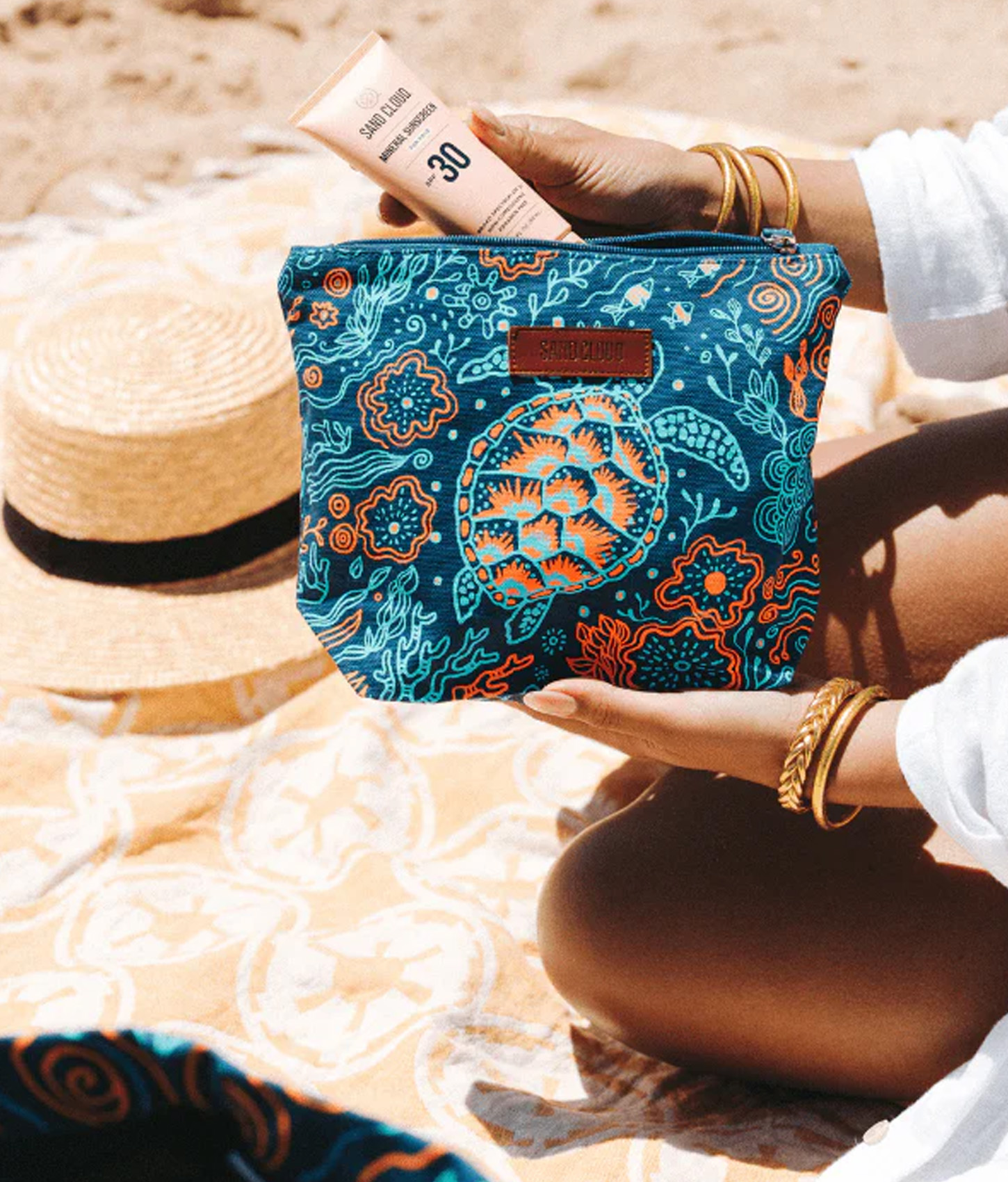 The Assorted Amelie Pocket from Maaji is a recycled cotton makeup bag with a zipper, multiple inner pockets, and the sweetest black and white prints.