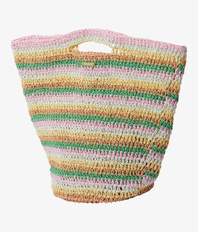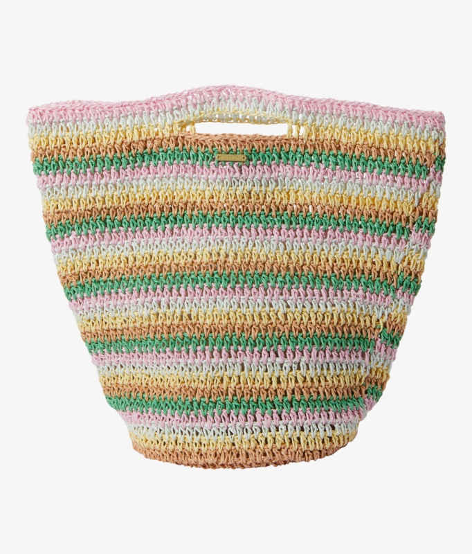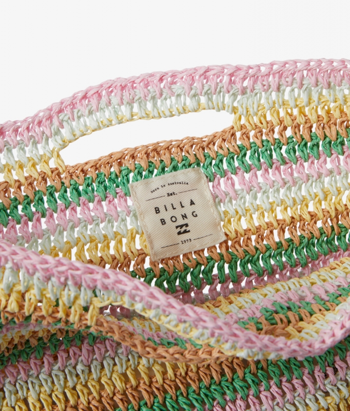 The Island Life Straw Tote from Billabong is a cute little handbag made from paper straw and featuring a bright and colorful striped pattern.