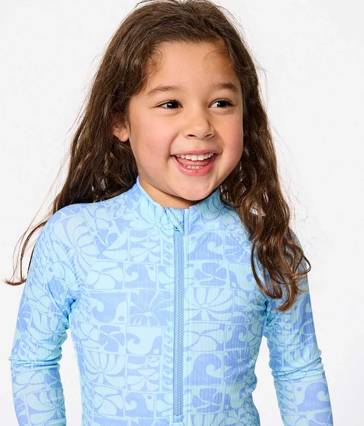 The Artist Of The Search Oceanic Long Sleeve Surf Suit Swimsuit - Girls (1-8 years) from Rip Curl provides full UPF 50+ protection with all-over yardage print. Made from recycled polyester rib fabric, it is chlorine friendly and features a front zip and woven clamp.