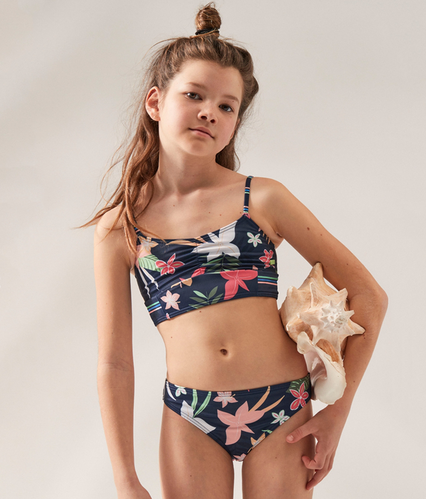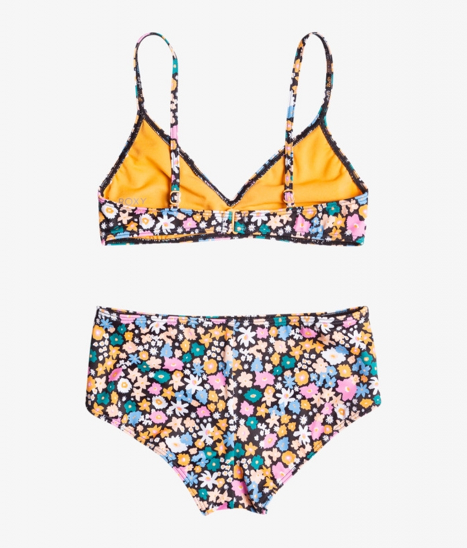 The Girl's 7-16 Active Joy Triangle Two Piece Bikini Set from Roxy is a very sweet two piece bikini set with a floral print. It is made of stretchy, chlorine-resistant recycled fabric and includes adjustable straps and a matching full-coverage bottom.
