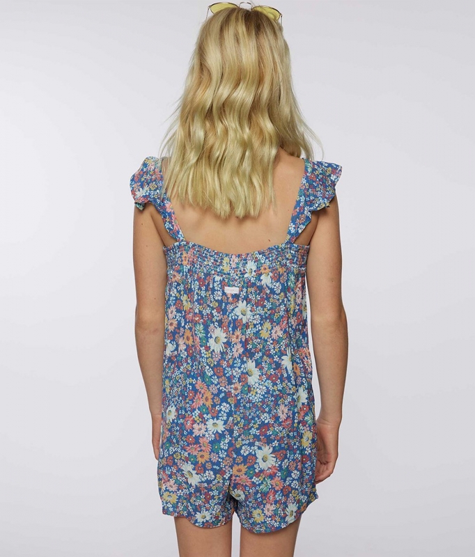 The Girls Augie Romper by O'Neill is a short tank romper with a smocked back opening and ruffle straps.