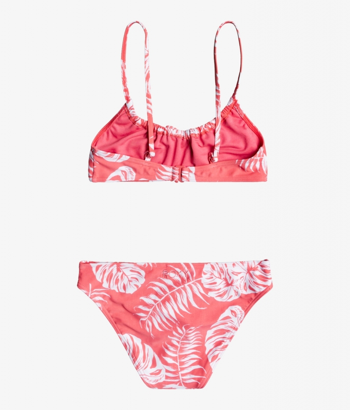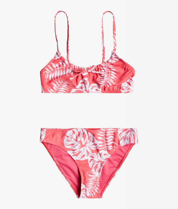 The Girls California Friends Bralette Bikini Set by Roxy is a two piece swimsuit with a bra style top design and classic bottoms, stretch fabric and all over print.