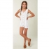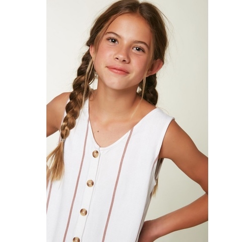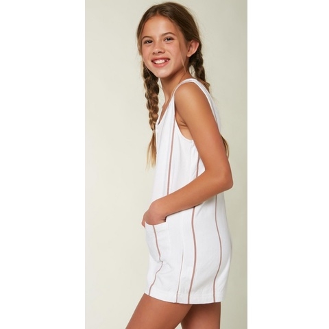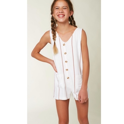 The Girls Immie Romper by O'Neill offers a v-neck and back with yarn dye stripe, dual hand pockets and a front button placket.