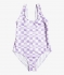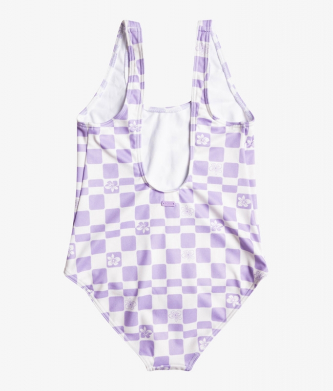 The Girl's 7-16 Magical Waves One-Piece Swimsuit from Roxy features an all-over checkered print in the sweetest lavender, or Purple Rose FlowerBox, color. It's made from recycled polyester, giving it an eco-conscious benefit.