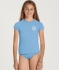 The GIRLS' STAY SALTY SHORT SLEEVE RASHGUARD by Billabong features raglan sleeves with a crew neckline and "Mermaid Club" logo graphic at the front left chest.