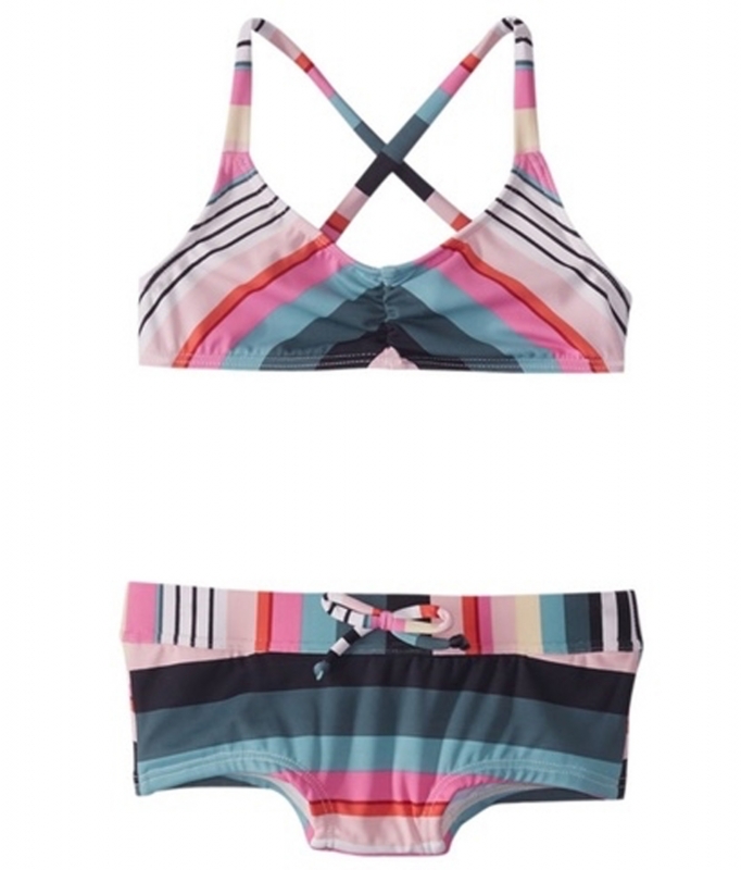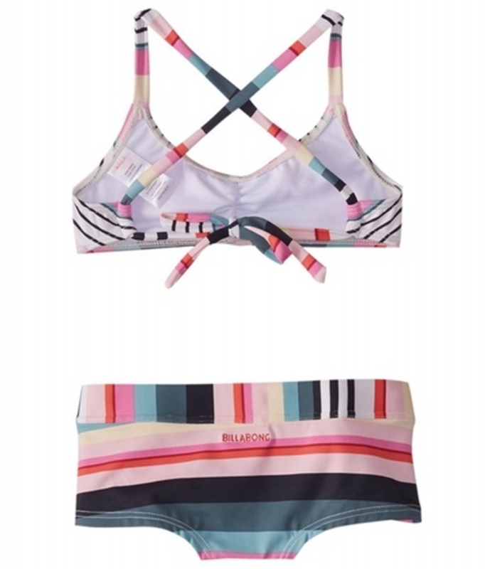The Girls Sun Faded Crossback Set by Billabong is a striped swim set with boy short style bottoms, crisscross straps at the back and faux drawcord.