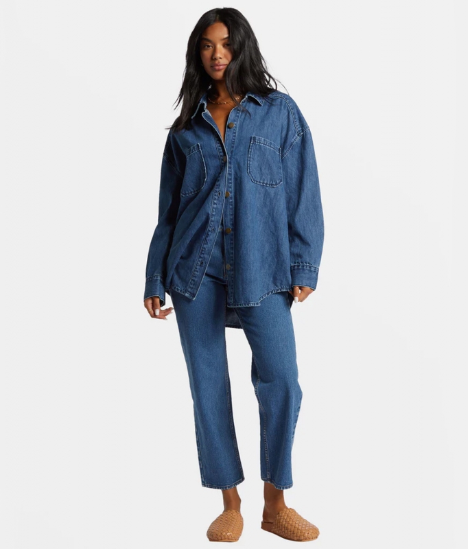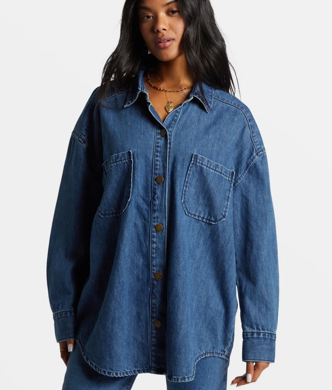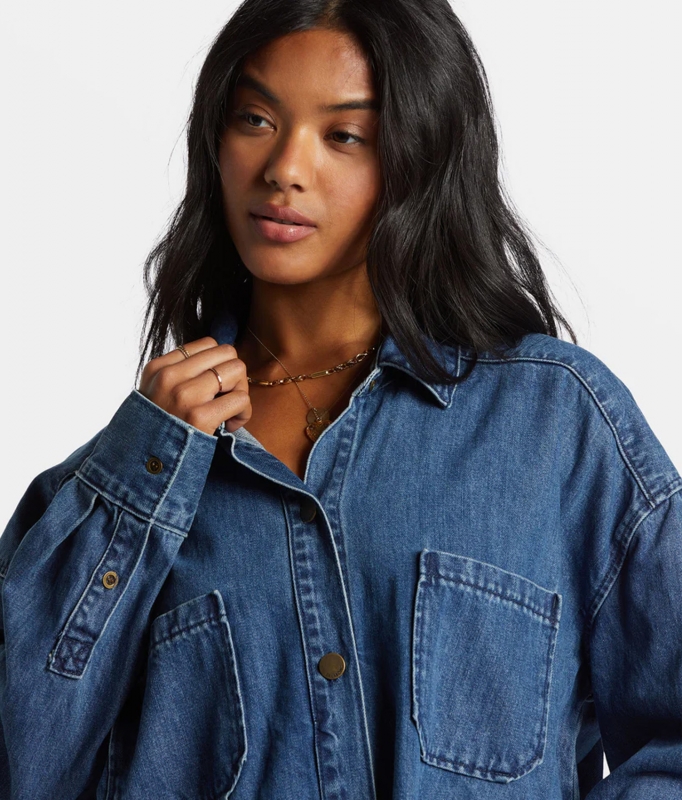 The Deep Sea Denim Shirt from the Love Army collection by Billabong is a heavy weight, cotton indigo denim in an oversized boxy fit. With patch pockets and metal details, it's your go-to Fall piece for effortless style.