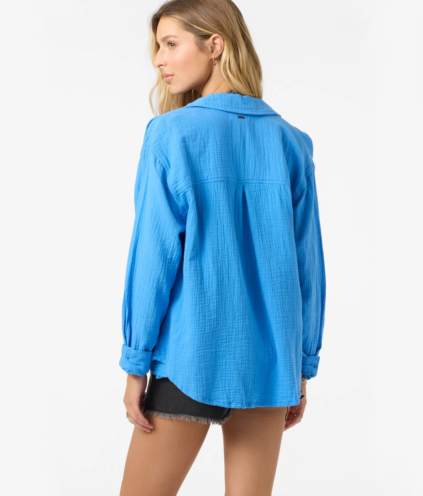 The Leni Relaxed Long Sleeve Top is an effortlessly cool woven long sleeve top that has an oversized fit design, front button closure with collar and yarn dye solid wash.