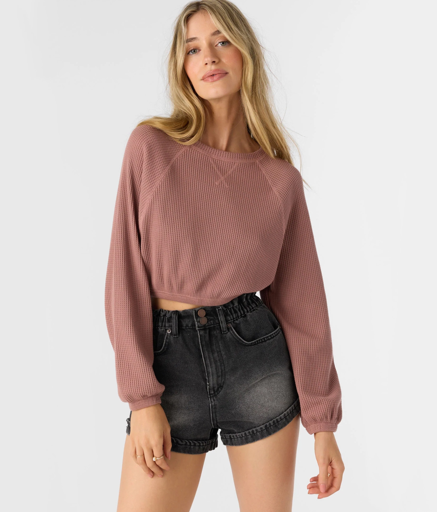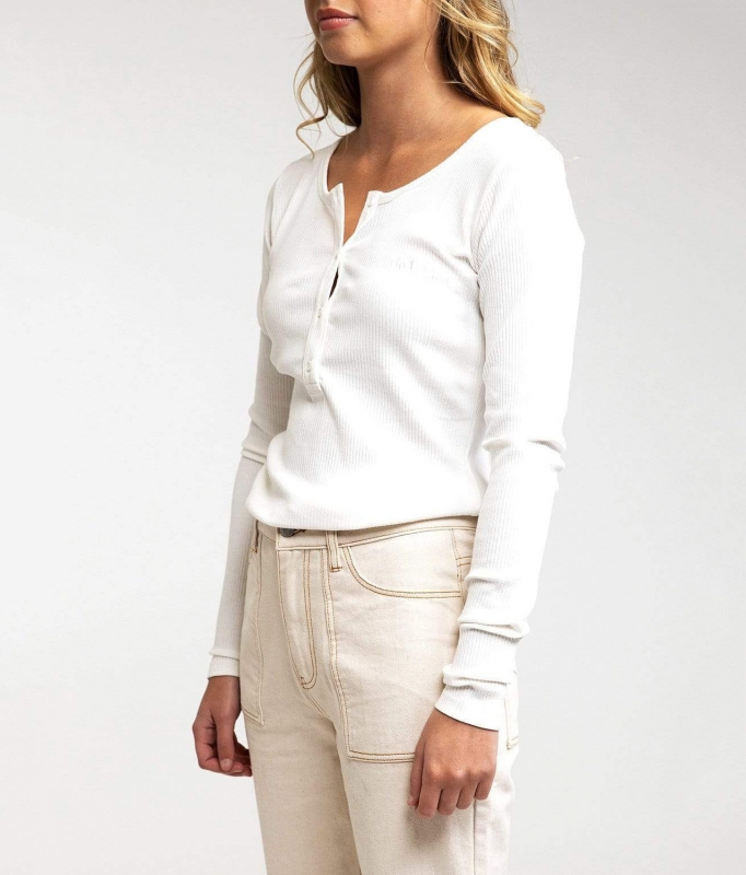 The Outlander Rib Henley by Rhythm offers super soft rib fabrication with a scooped hem, front button opening and long slim sleeves.