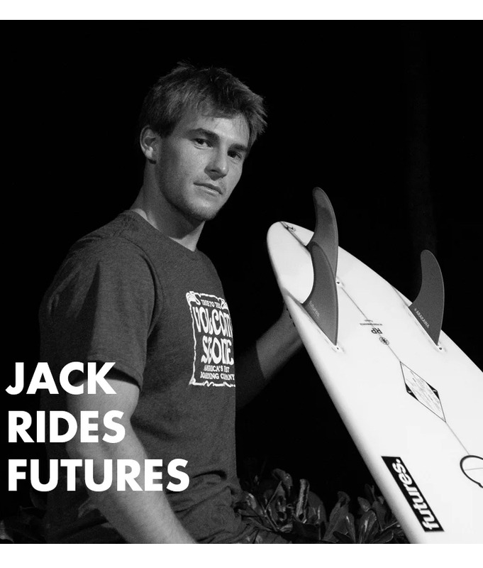 Jack Robinson's signature Techflex thruster fin by Futures is a large size fin in the Rake template category. Developed to suit Jack's style of surfing above and below the lip, he has been putting it through the paces at some of the best waves in the world with incredible success. The Techflex construction is Jack's go-to when the waves are pumping and he desires a bit more control from his fins. Techflex fins are engineered to be stiff and light, providing a solid and engaged feel for powerful surfers or powerful conditions. The center fin is smaller than the side fins for increased maneuverability.
