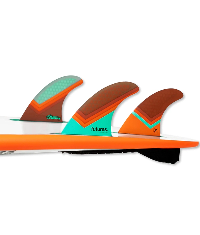 The TP1 Honeycomb Thruster Fin Set by futures are Timmy Patterson's classic pivot template in Honeycomb construction, re-issued with a fresh new graphic and retro inspired colors.