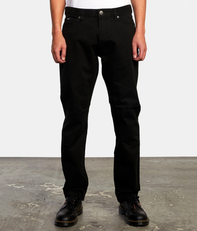 The RVCA Daggers are stretch slim fit twill pants with a zipper fly closure. They feature a RVCA logo patch at back waistband, V and A embroideries at back pockets, and RVCA solo label at coin pocket