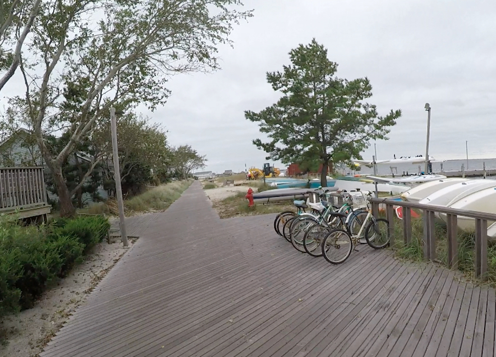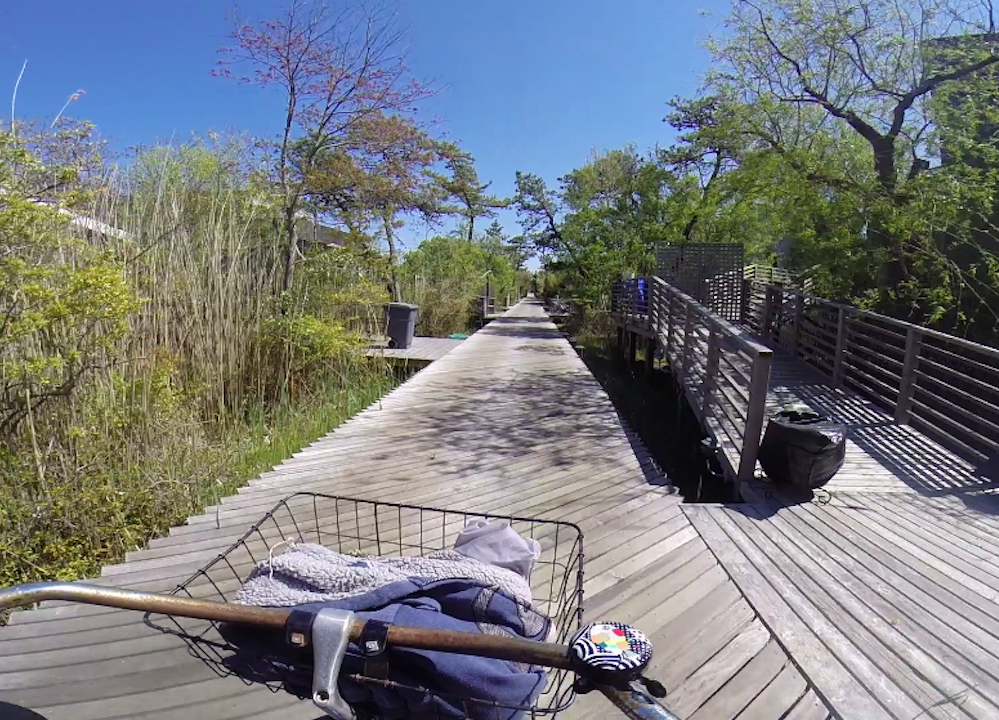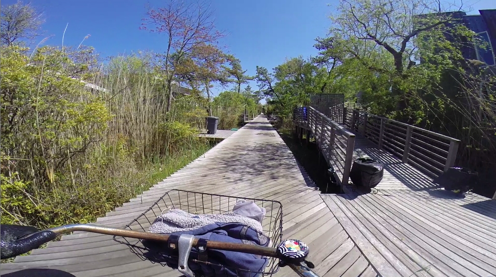 We loaded the taxi with boards, sails, kites, and foils and headed for the island. We did a quick unload on the other side, then hit the sack. The next morning looked to be the windiest day of the trip according to the forecast so we had to hit it early. The Saltaire village of Fire Island is made up of a grid system of boardwalks. There are no cars on the island so everyone gets around by bike which worked out just fine for us. We had some solid northeast breeze all morning that sent us out to the oyster flats where we chased each other around until the wind started to die.