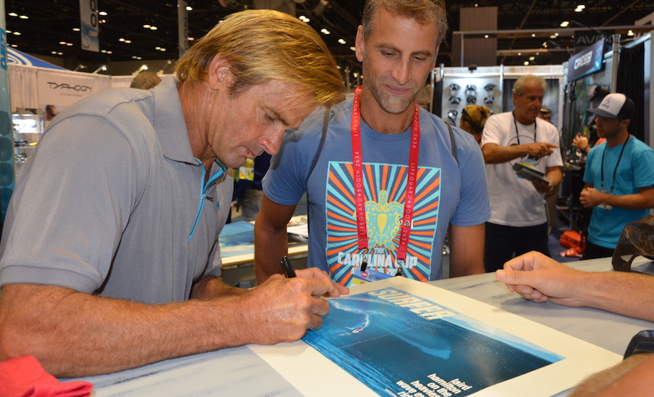 After about 40 minutes it was time to start talking about the business that brought us to Surf Expo in the first place. That's when Josh politely interrupted the coffee dialog to move the conversation to their 2016 SUP line. At that point Laird turned toward the growing mass of people lined up at the booth waiting for an opportunity to get a photo and an autograph with Laird. The booth had a table with a stack of posters eight inches high ready for Laird to start signing and distributing to his fans.