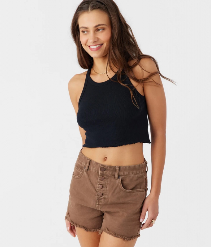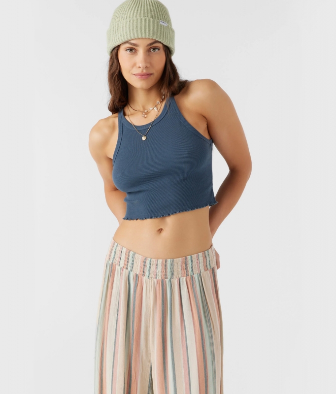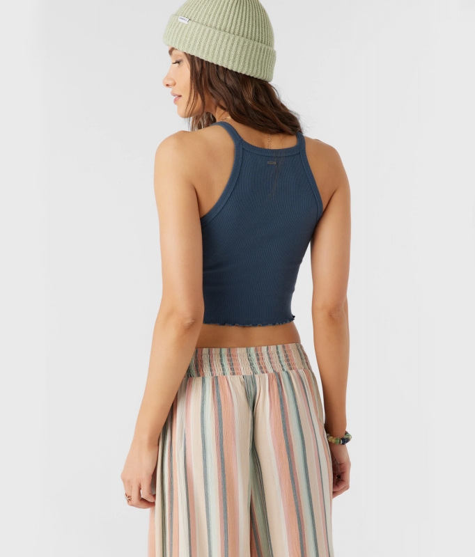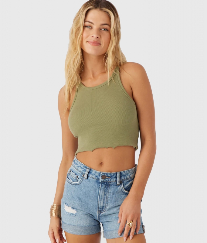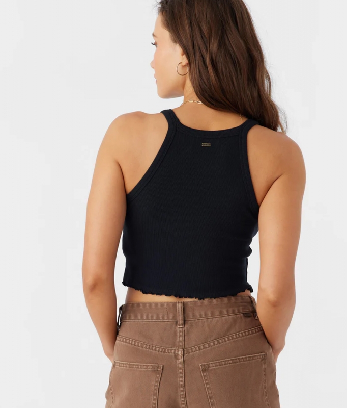 The Alyx Rib Knit Tank Top from O'Neill is a cropped tank featuring a lettuce hem and racerback.