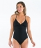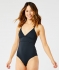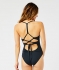 The Dahlia One Piece is a classic "little black" bathing suit. It's got a flattering v neck design and criss cross tied back.