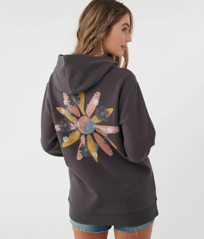 The Forever Fleece from O'Neill is a classic hoodie with drawstrings and a retro surfboard flower graphic.
