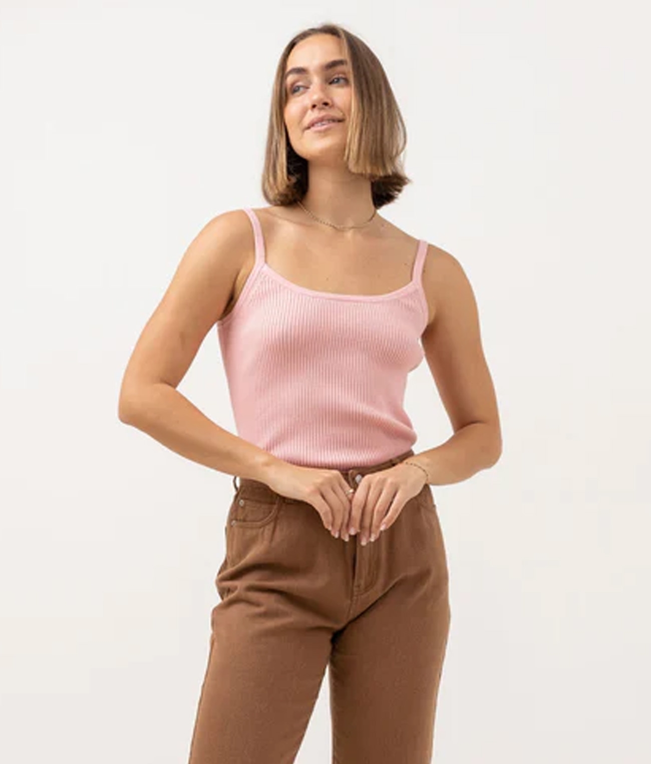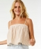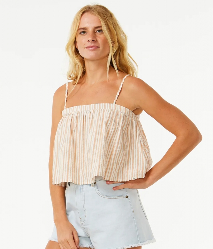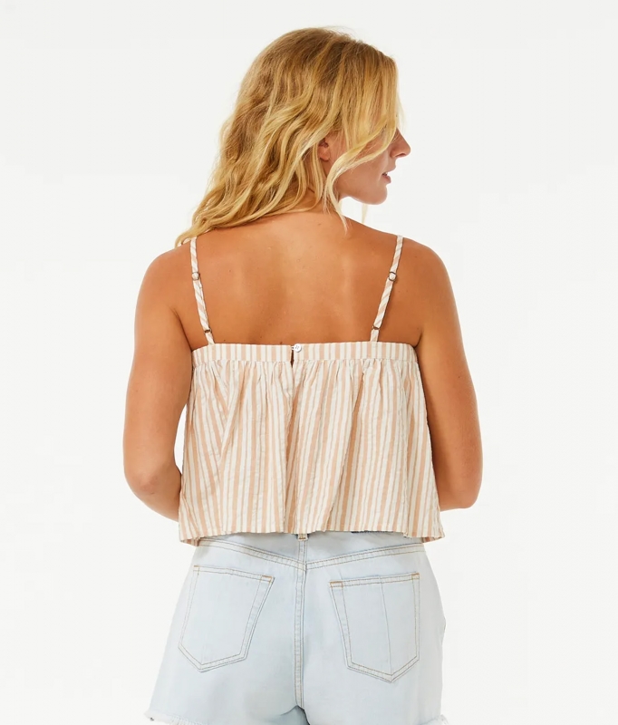 The Hilo Top from Rip Curl features a seersucker striped pattern, cropped, loose fit, adjustable straps, and an adorable button closure on the back.