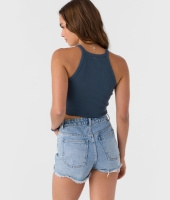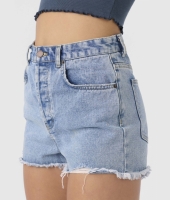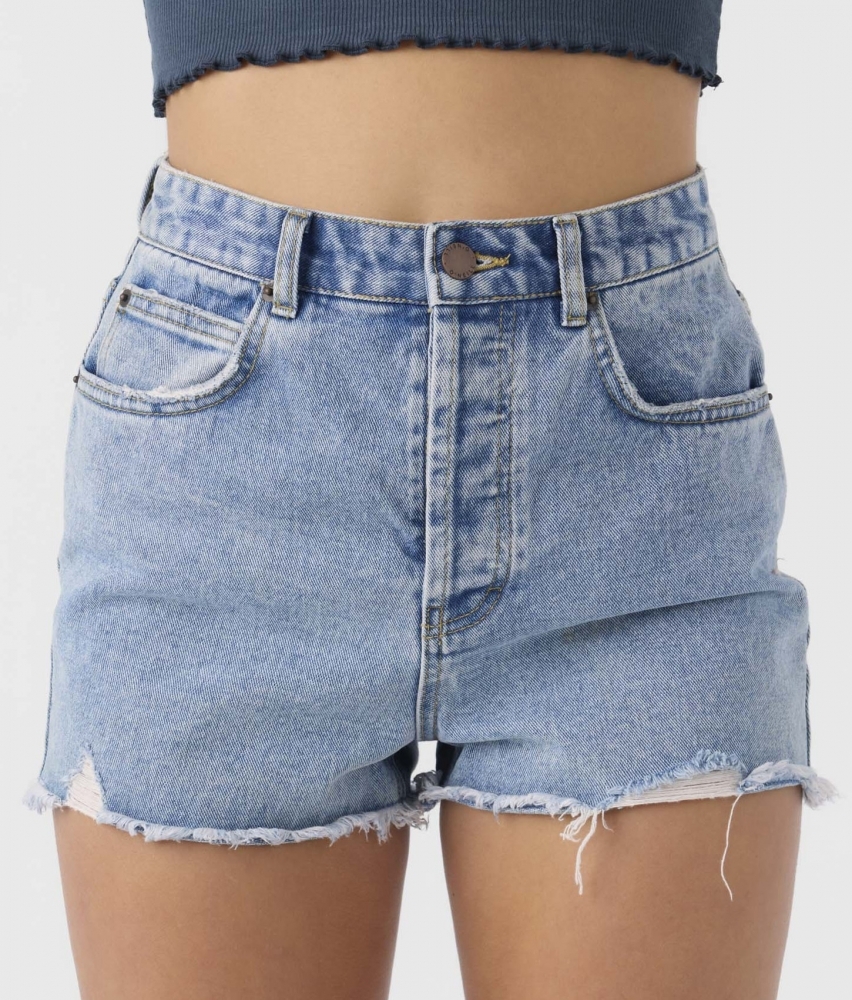 The Lanisa Denim Shorts from O'Neill are a pair of jean shorts featuring a medium rise, distressed look and raw hem detail.