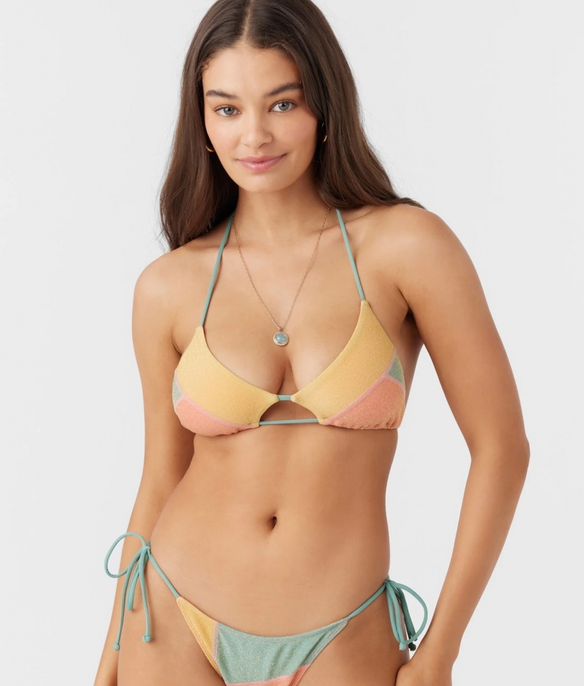 The Mirage Colorblock Madrid Halter Top from O'Neill has a super fun, color block design. It features a front cutout detail and ties at the back.