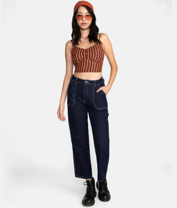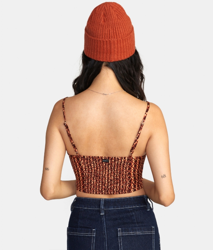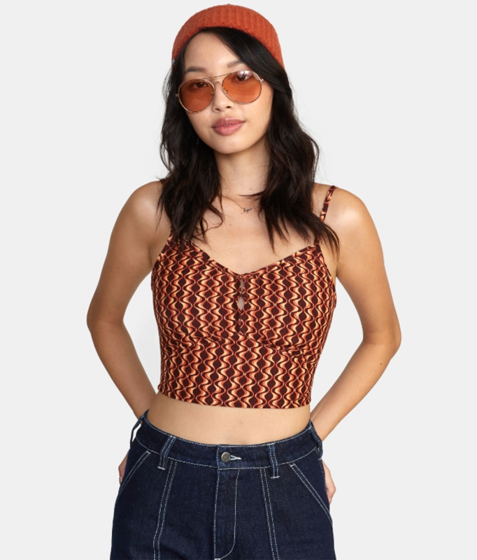 The Moxy Tank by RVCA offers a cropped design with a v-neckline and smocking at the back for a custom fit.