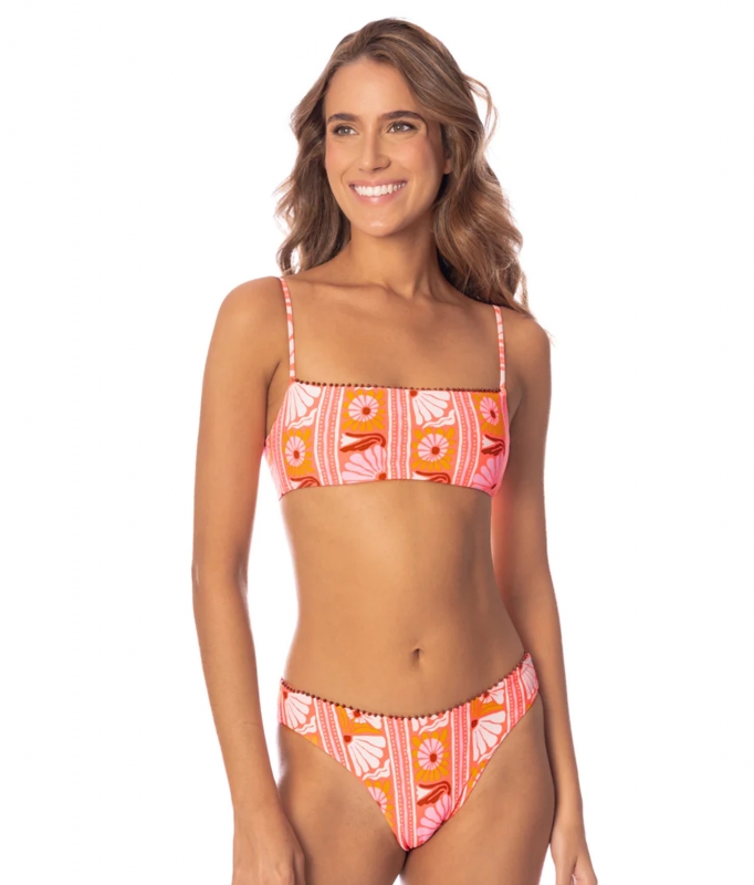The Peach Flowers Dallas Classic Bralette Bikini Top from Maaji is a reversible top featuring a square neckline, criss cross tie back, and bright floral print.