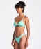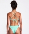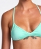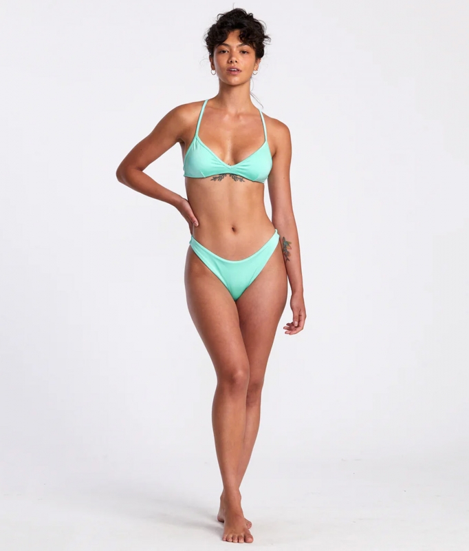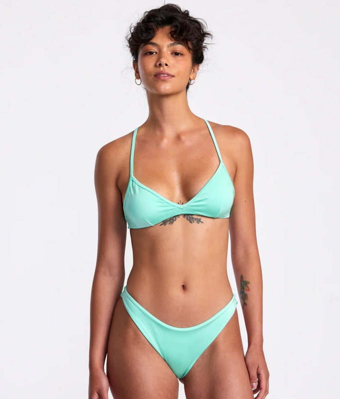 The Solid Shimmer Crossback Triangle Bikini Top from RVCA is made from recycled fabric and features a fun triangle shape and cross back, removable padding, and a mermaid-like sheen.