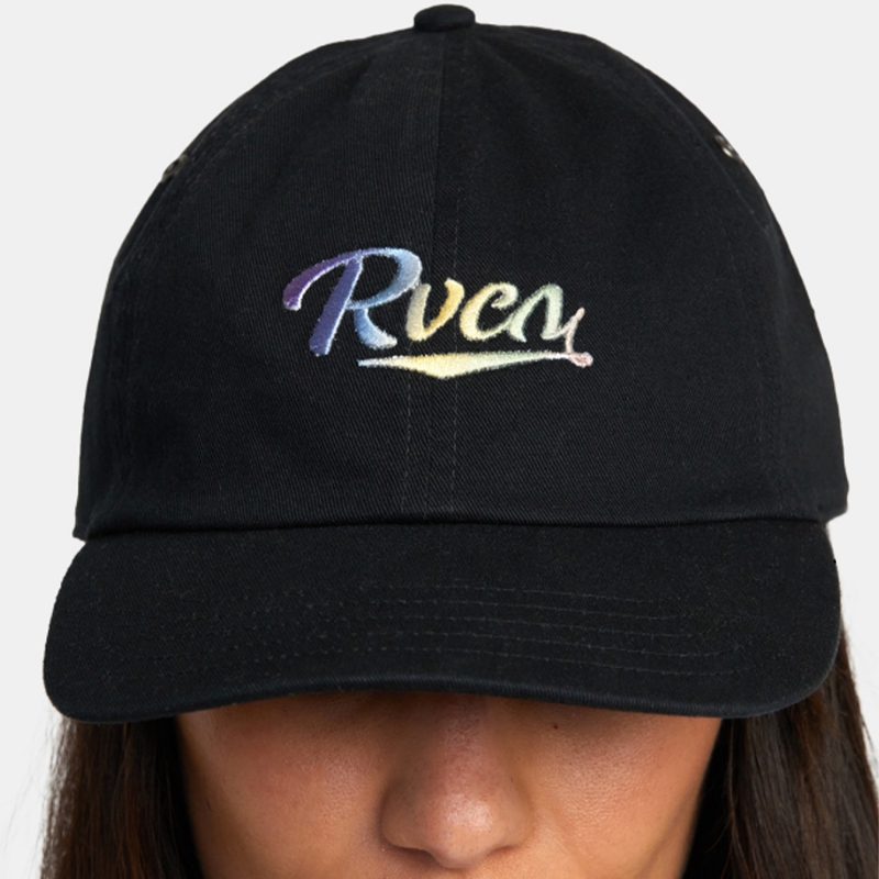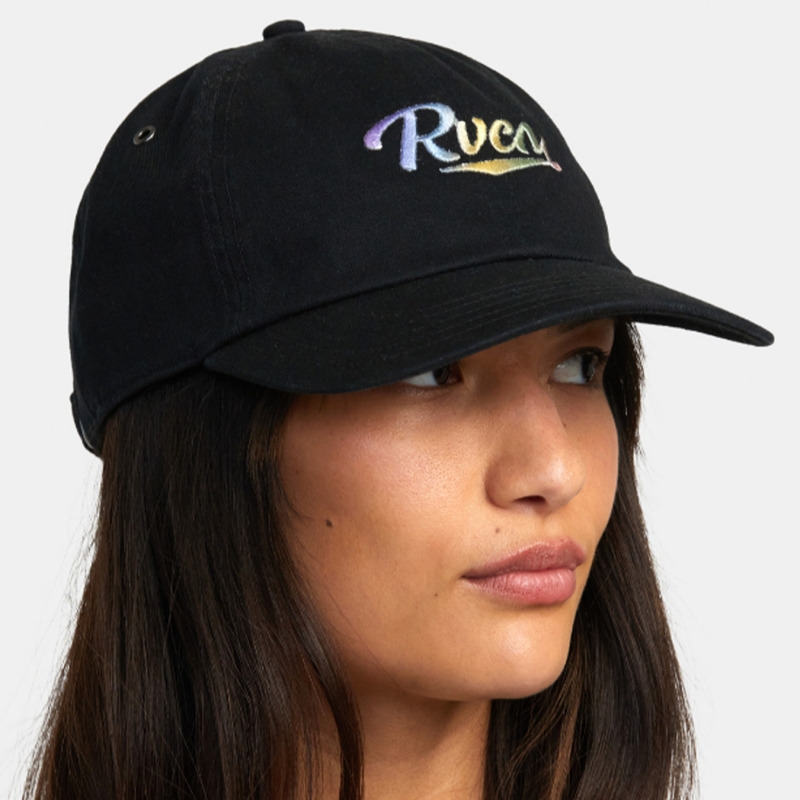 The Staple Dad Hat from RVCA features a rainbow embroidered logo patch on black cotton twill. It is a classic cap with a little flare.