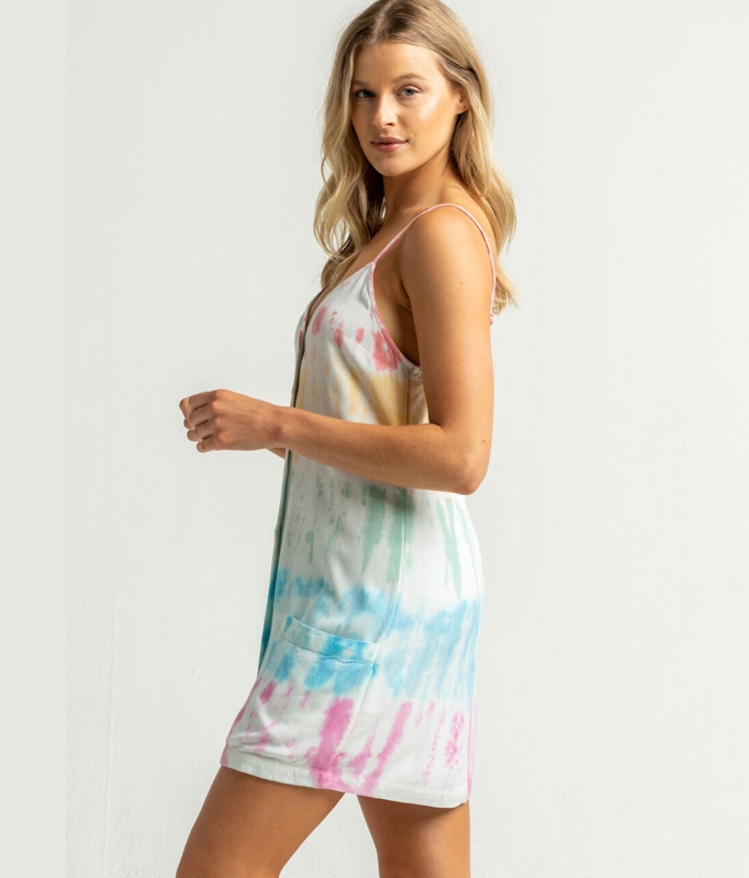 The Wipeout Dress by Rip Curl is a cute mini designed with all over tie dye prints and a full button placket down the fronts, fully adjustable straps and metal logo trim.