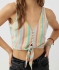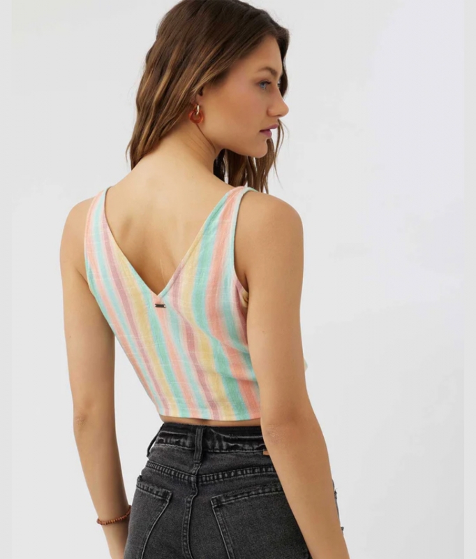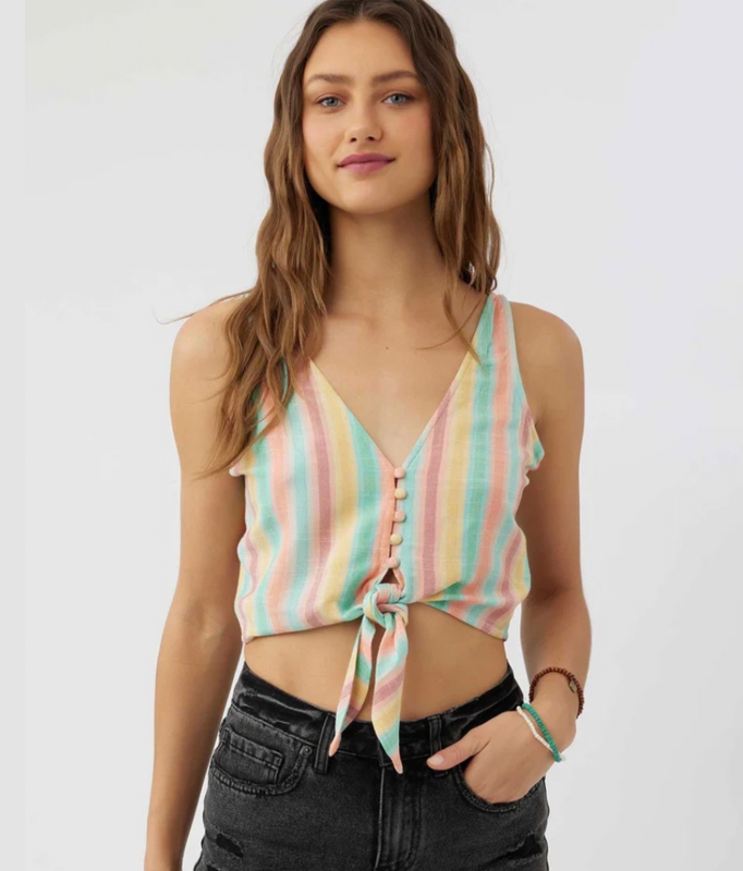 The Zera Stripe Top by O'Neill is a woven tank with a skimmer length fit, front tie detail, button front and allover print design.