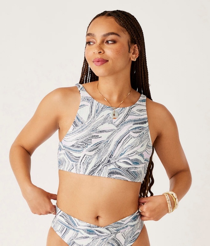 The Zuri Top from Carve Designs offers a sporty, high-neck silhouette with a playful strappy back. It provides moderate support with molded cups and adjustable straps to fit to your form.